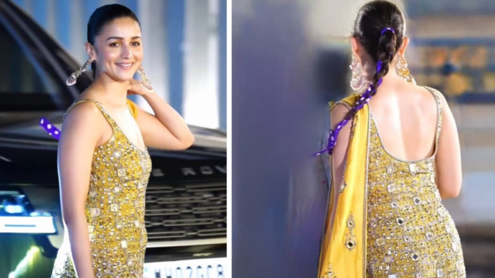 Alia Bhatt celebrated Aadar Jain and Alekha Advani’s mehendi ceremony in true Punjabi style! Alia was accompanied by her husband, actor Ranbir Kapoor and her mother Soni Razdan. They posed for the media outside the venue, before joining in the festivities.