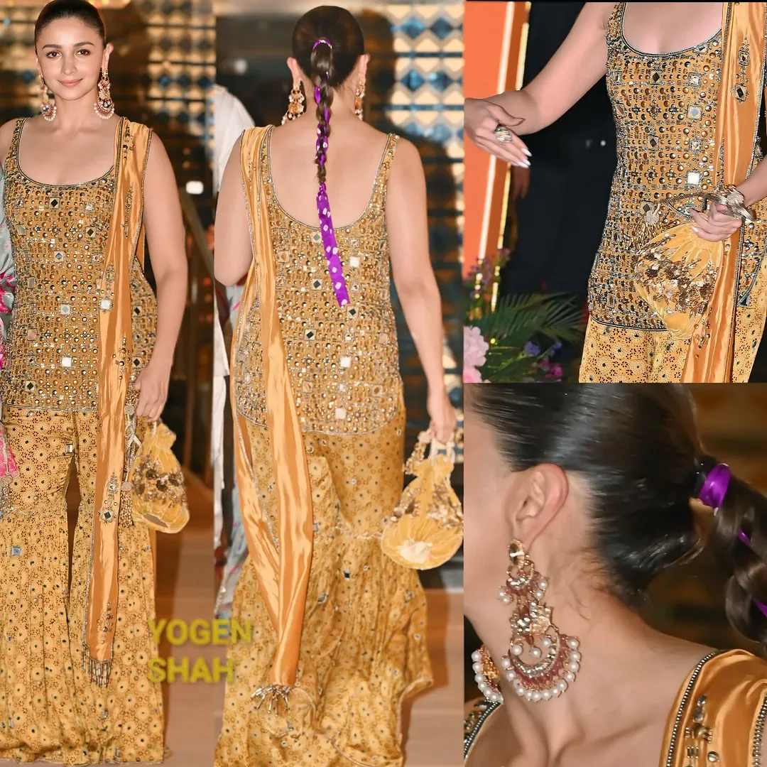 Alia Bhatt attended Aadar Jain and Alekha Advani’s mehendi ceremony in an Anushka Khanna ensemble and Amaris Jewels.