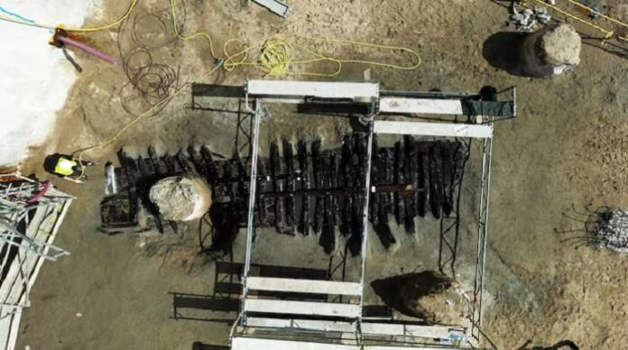 A large fragment of the boat, 10 metres long and three metres wide and crossed by more than 30 curved wooden ribs, was found in good condition at a depth of five metres below sea level.